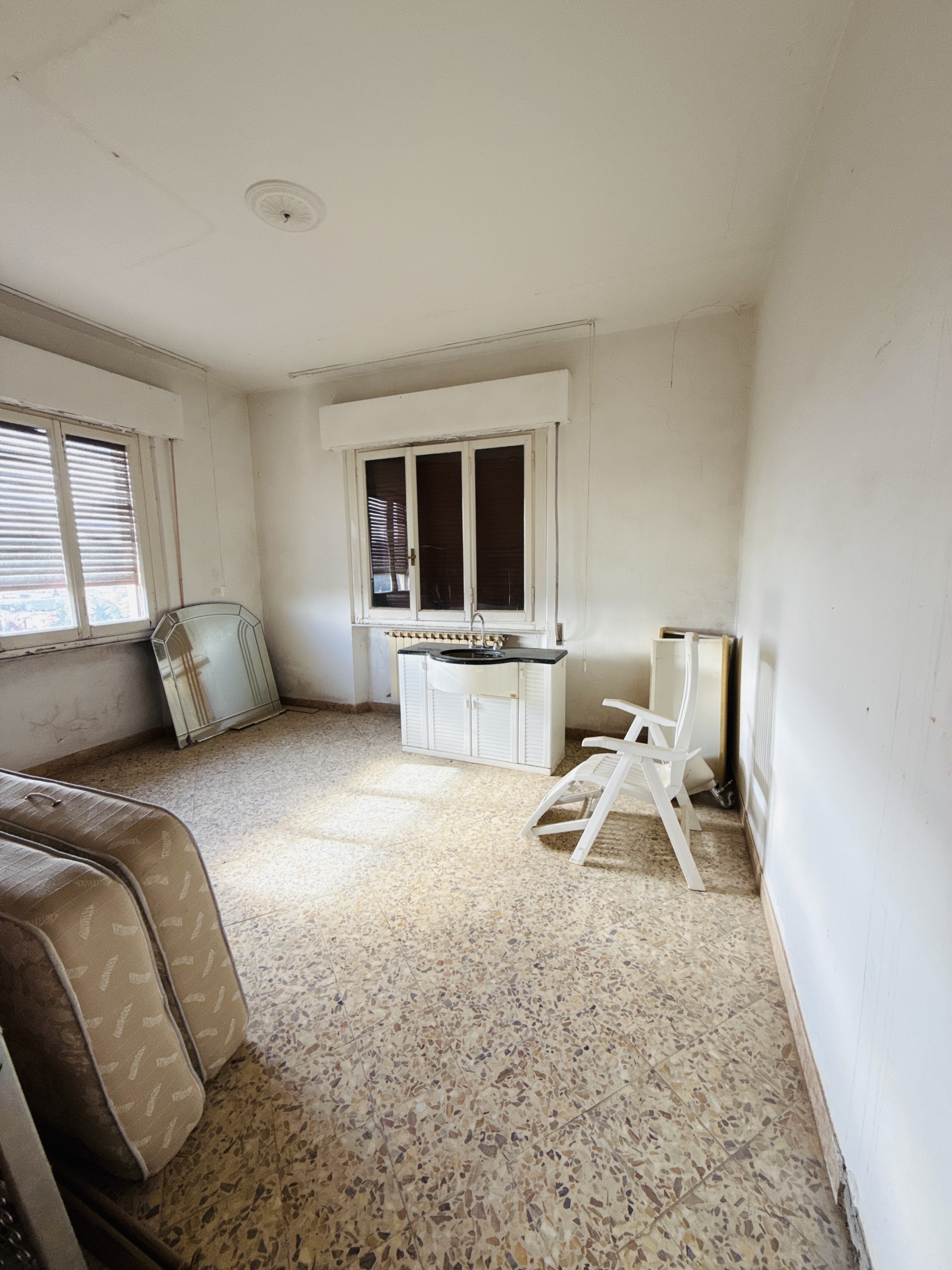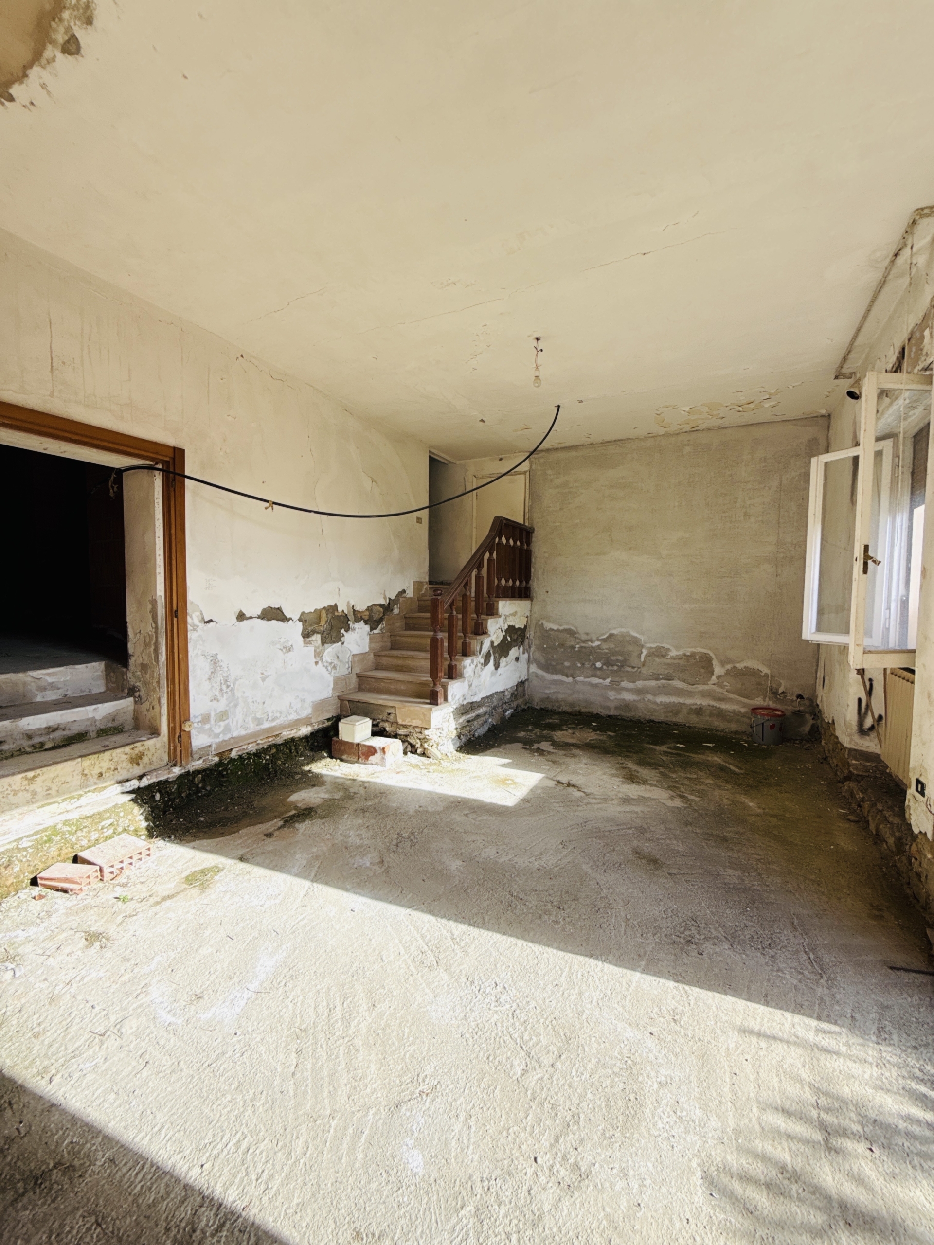 L’immobile, risalente al 1960, è completamente esistente ma necessita di ristrutturazione per gli impianti, infissi e pavimentazione. Il tetto è in buone condizioni e non richiede interventi. L’appartamento più piccolo dispone di tre stanze, un bagno e un accesso al balcone, mentre l’appartamento più grande vanta una spaziosa zona giorno con salone e cucina abitabile, due camere matrimoniali e un secondo bagno.
